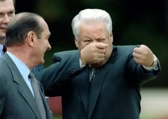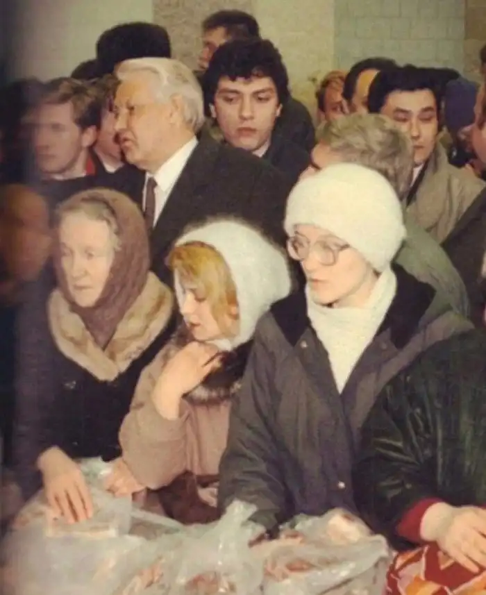 12. В начале 90-х Ельцин любил ходить по магазинам. За его спиной еще совсем молодой Немцов