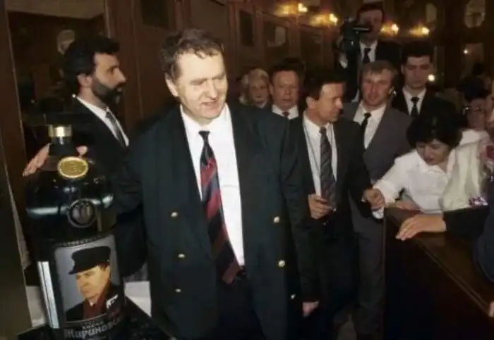 11. Владимир Жириновский с именной бутылкой водки. На заднем плане Анатолий Кашпировский. 1994 год