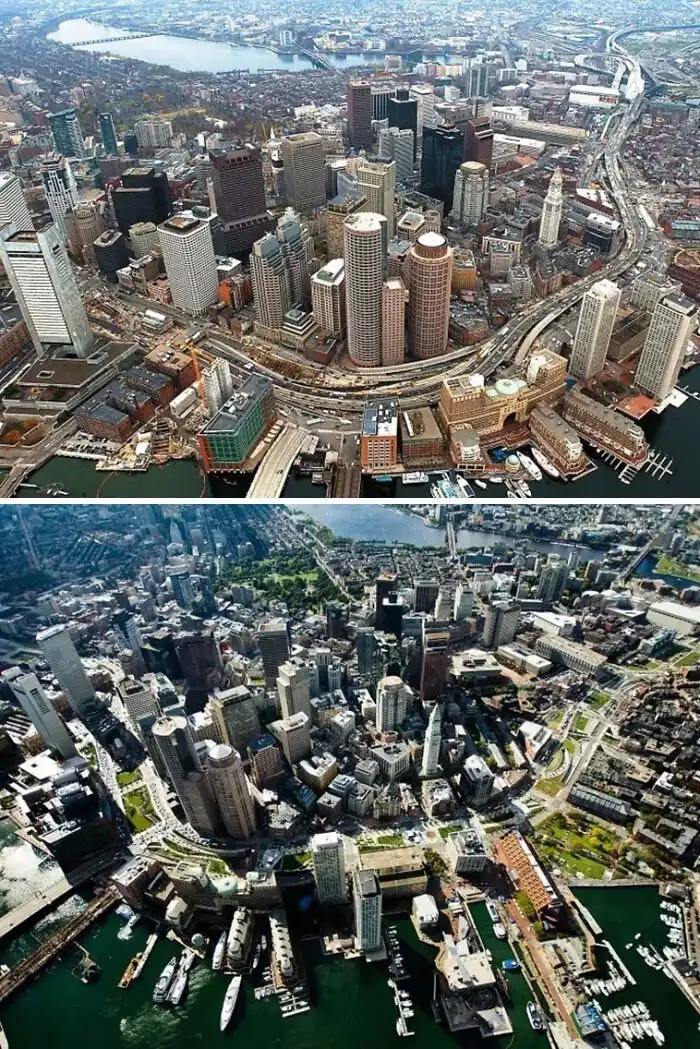 4. Бостон в 1990-х и 2010-х годах. Эстакаду перенесли под землю и заменили зелеными насаждениями