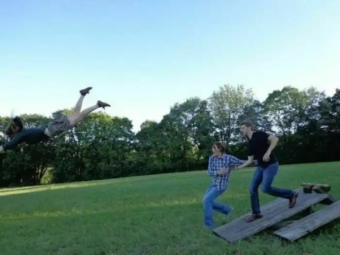 Эта троица дурачится на улице, делая вид, что едет вместе на мотоцикле.