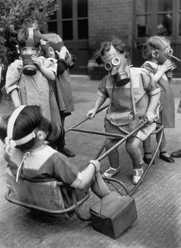 Маленькие дети в парке с противогазами, 1940 год