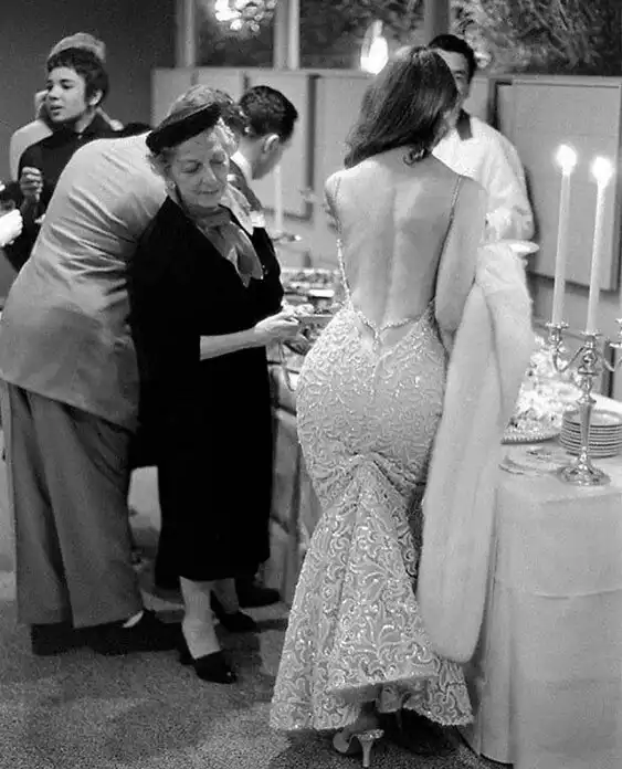 8. Пожилая женщина рассматривает откровенное платье актрисы Викки Дуган на фуршете, Лос-Анджелес, США, 1957 год.