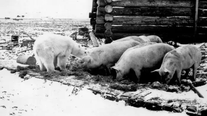 23. Свиньи обедают с белым медведем на архипелаге Новая Земля.