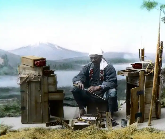 28. Бродячий торговец табачными трубками эпохи Мейдзи. Фотография Т.Энами. Япония. 1890 год
