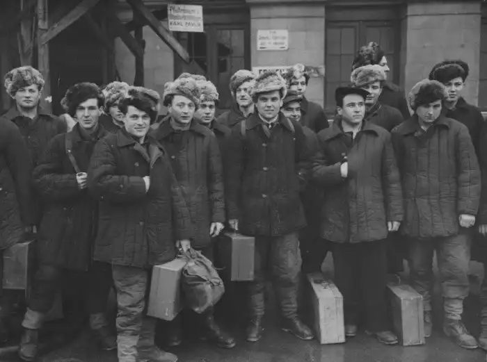 34. Группа бывших итальянских военнопленных на улицах Вены, на пути домой из СССР. 1950 год
