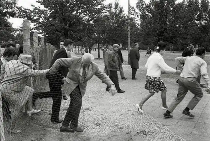 38. Жители Восточного Берлина бегут на Запад через дырку в заборе, пока пограничники не видят, Берлин, 15 августа 1961 года.