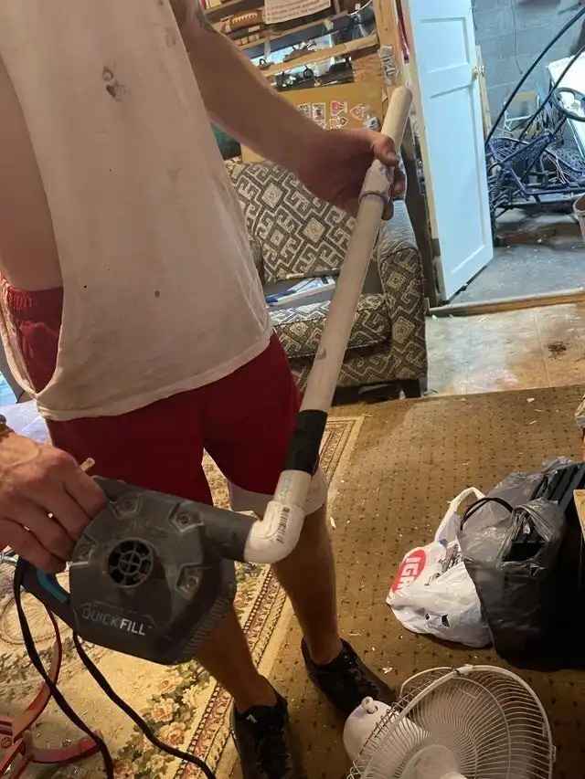 Воздуходувка для листьев сделана из насоса от надувной кровати и трубы
