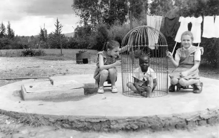 Бельгийские девочки играют с ребёнком, купленном их родителями в человеческом зоопарке. На минуточку, это 1955 год.