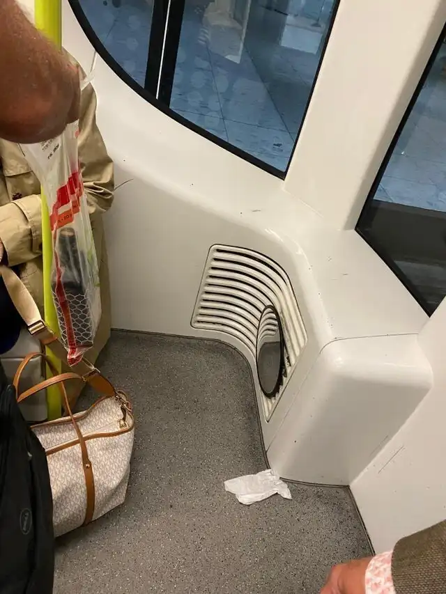 Низкие зеркала с обеих сторон в передней части купе монорельса в аэропорту
