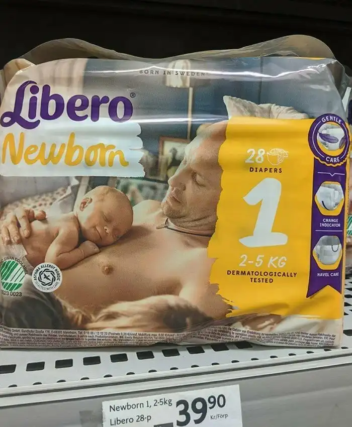 На упаковке шведских подгузников изображен папа с малышом