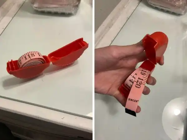Как хранить измерительную ленту. Моя мама всегда сохраняет ёмкости, чтобы пользоваться ими в будущем, поэтому она использует контейнер от жевательной резинки Hubba Bubba для измерительной ленты. Идеально подходит.