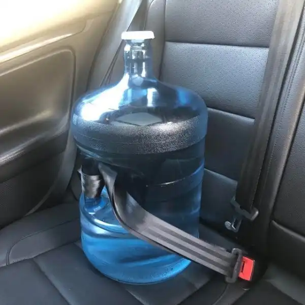 Чтобы перевозить большие бутыли с водой, можно пристегнуть их ремнём безопасности, чтобы не разлить
