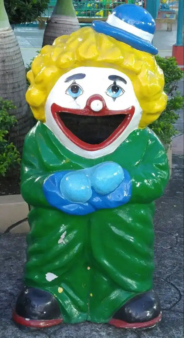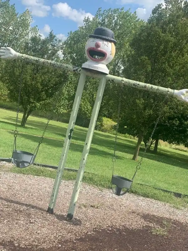 Страшные качели в виде клоуна стоят во дворе начальной школы
