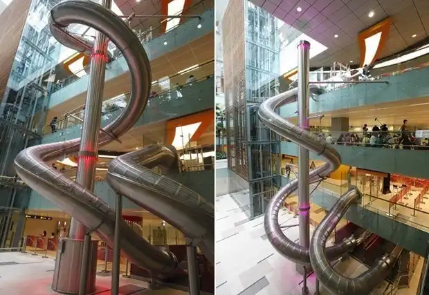 В аэропорту Чанги в Сингапуре есть трехэтажная горка (высотой 12 метров), где пассажиры могут рассчитывать на максимальную скорость 6 м/с при спуске на случай, если они опаздывают на свой рейс.