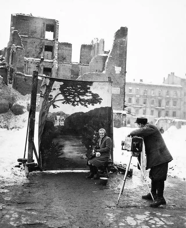 Фотограф использует свой собственный фон, чтобы замаскировать руины Второй мировой войны в Польше, Варшава, 1946 год