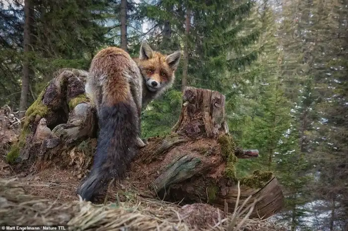 Швейцарский фотограф Мэтт Энгельманн - автор этого захватывающего снимка, который был сделан в горах Граубюнден на востоке Швейцарии. «Я внимательно наблюдал за лисой в течение месяца и заметил, что она часто приходит метить эту точку»., - говорит он. По словам фотографа, снимок сделан с дистанционным спуском затвора, чтобы не тревожить лису. Впечатливший судей снимок занял второе место в категории «Дикие портреты».