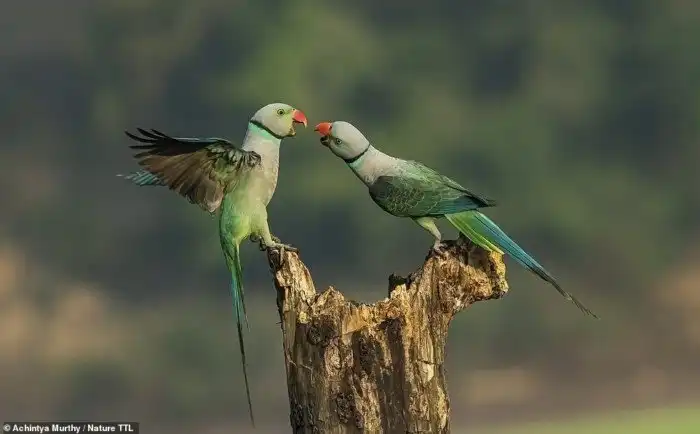 Этот впечатляющий снимок занял первое место в категории «Фотографы до 16 лет». Снимок, сделанный индийским фотографом Ачинтьей Мурти, которому всего 13 лет, показывает пару малабарских попугаев (также известных как синекрылые попугаи) в городе Хосанагара в индийском штате Карнатака. Мурти, который описывает этих птиц как «чудесных существ», говорит: «Обычно они сбиваются в стаи, и их можно увидеть в огромном количестве… Мне выпала честь сделать этот снимок из укрытия для наблюдения за птицами». Мурти отмечает, что птицы дерутся из-за пня.