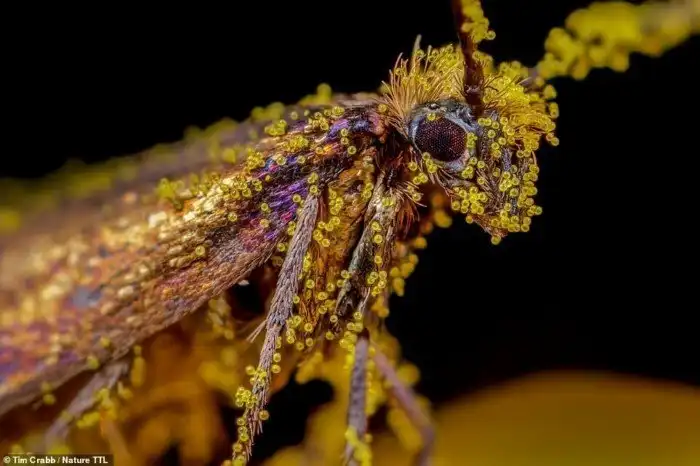 На этом очаровательном снимке изображена микробабочка Micropterix calthella, покрытая золотыми шариками пыльцы ползучего цветка лютика. Снимок был сделан на пешеходной туристической тропе недалеко от Сидмута в Девоне, Англия. Под названием «Красотка в пыльце» это работа британского фотографа Тима Крэбба, представляющая собой «компиляцию» фотографий, заняла второе место в категории «Маленький мир».