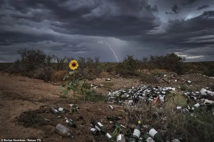 Описывая этот пронзительный снимок, южноафриканский фотограф Бертус Ханеком говорит: «Гроза обрушивается на подсолнух, который, несмотря ни на что, сумел выжить на свалке в полузасушливом регионе Кару в Южной Африке». Картина под названием «Природа наносит ответный удар» стала абсолютным победителем в категории «Пейзажи».