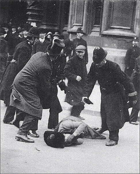 Женщина, попытавшаяся принять участие в выборах. При попытке войти на избирательный участок ее вытолкали и бросили на землю. Великобритания, 1872 год