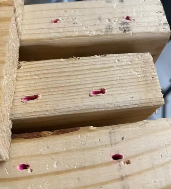 Разбираю поддоны. В отверстиях остаются розовые следы от гвоздей. Такая же розовая пыль — на самих гвоздях