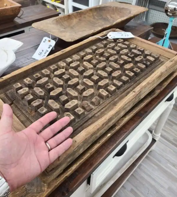 Деревянный ящик без крышки со странным узором внутри. Размер примерно 45×76×8 см