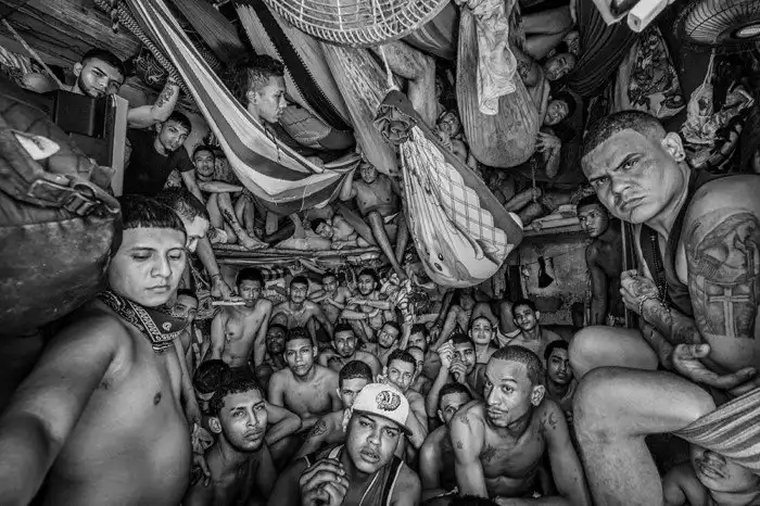 Преступники сидят в камере полицейского участка Майкао в Колумбии. Тюрьмы переполнены и им приходится отбывать наказание в местном отделении полиции. В нём содержится больше 300 заключенных, у них ограничен доступ к основным удобствам и нет возможности заниматься спортом, что является нарушением человеческих прав.