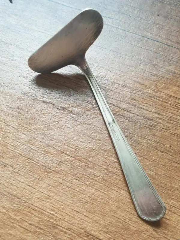 Это толкатель еды. Его использовали, чтобы наталкивать еду на ложку или вилку, сталкивать еду с сервировочных тарелок на свои. Также им пользовались люди с ограниченными возможностями.