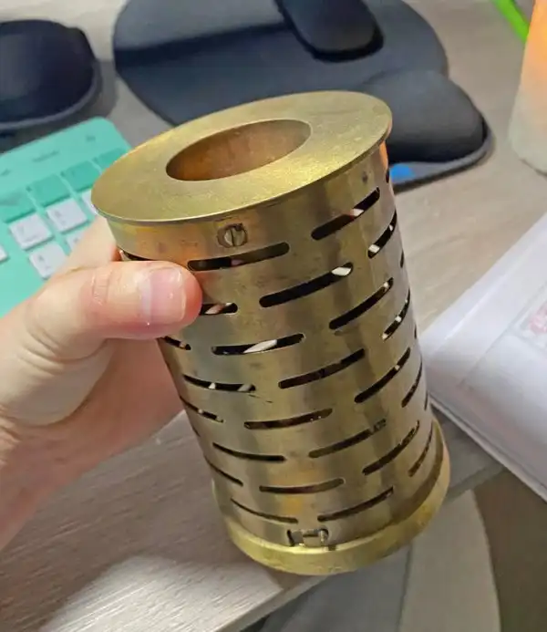 Этот цилиндр с длинными узкими отверстиями мы нашли в куче мусора. Он внутри пустой, нижняя часть откручивается