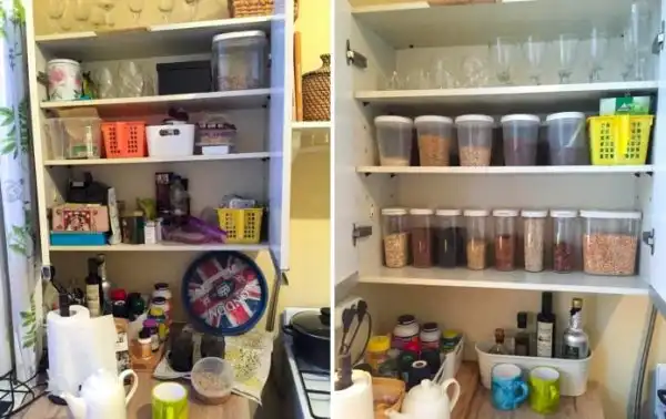 Открытые дверцы навесного шкафа показали, как неаккуратно выглядит его внутреннее наполнение. Владельцы кухни пересыпали все сухие продукты в одинаковые ёмкости – пользоваться системой хранения стало гораздо удобнее.