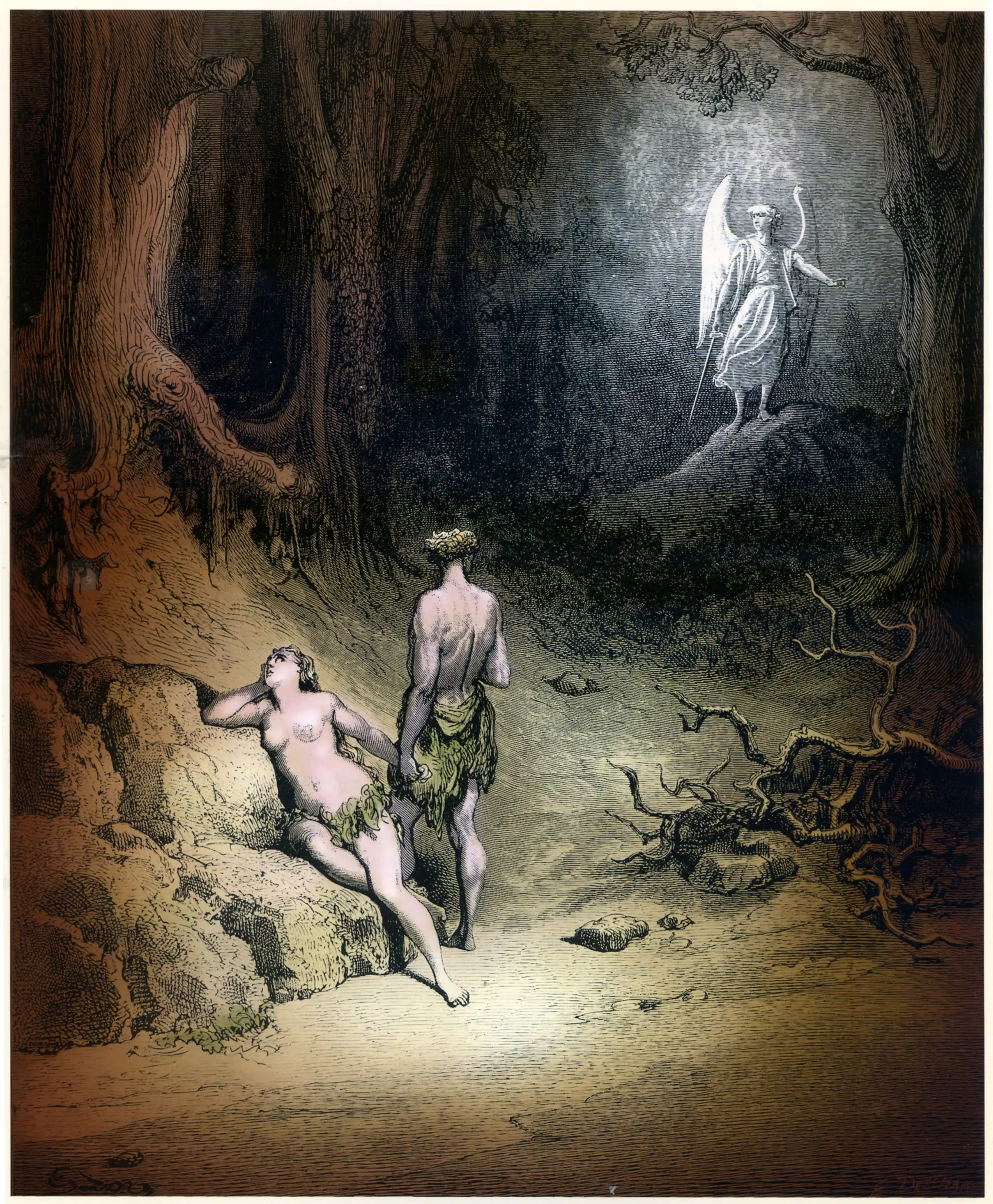 Сын Божий представляет Отцу молитвы наших кающихся прародителей и ходатайствует за них: Господь принимает их молитву, но объявляет, что они не будут жить в Раю. Он посылает Михаила с сонмом херувимов, чтобы вывести их оттуда, но прежде повелевает открыть Адаму события грядущих времён. Сошествие Михаила. Адам указывает Еве на некоторые зловещие признаки. Он видит приблжение Михаила и идёт к нему навстречу; Ангел возвещает об их изгнании из Рая. Рыдания Евы; просьбы Адама; его покорность. Ангел возводит его на высокую гору и в видении представляет ему всё, что произойдёт до потопа.