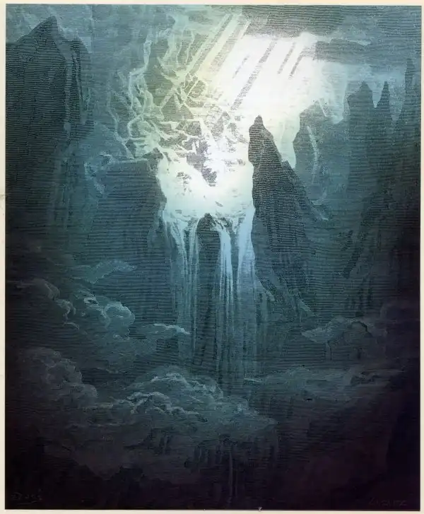 Сатана низвергается вместе с рекою и вместе с нею выходит, окутанный вечерним туманом