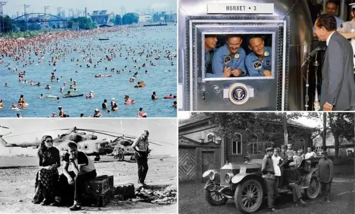 21. Американский президент Ричард Никсон навещает команду «Аполло 11», находящуюся в мобильной карантинной капсуле после возвращения с Луны