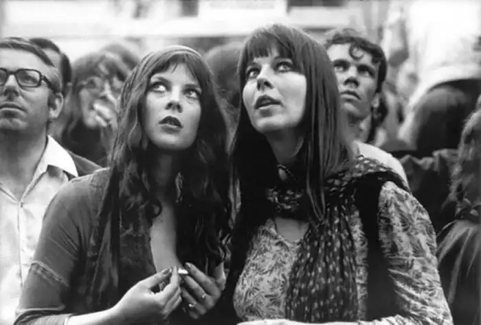 3. Две девушки-хиппи слушают британскую группу Pink Floyd во время фестиваля в Роттердаме в Роттердаме в 1970 году в Голландии