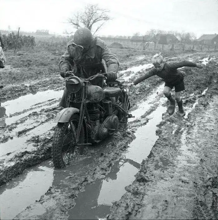 24. Голландский мальчик помогает выбраться из грязи британскому военному почтальону. 11 декабря 1944 год
