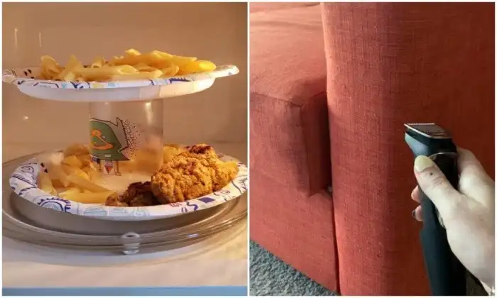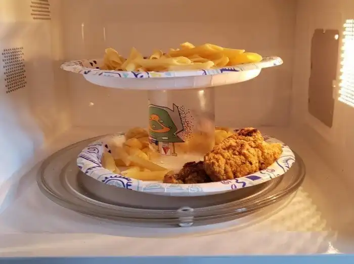 "Моя девушка случайно придумала этот способ разогревать еду в микроволновке. Зато всё разогревается равномерно!"