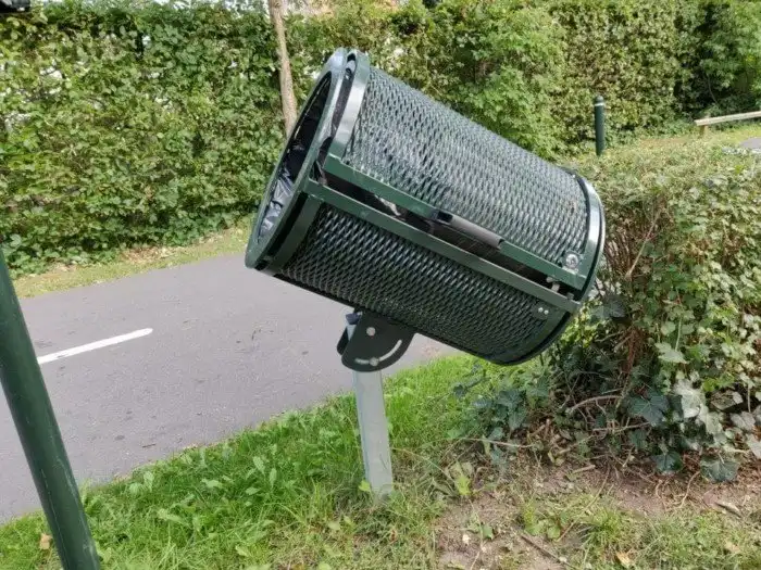 Мусорный бак, который наклонён под углом, чтобы в него легче было кидать мусор проезжающим мимо велосипедистам