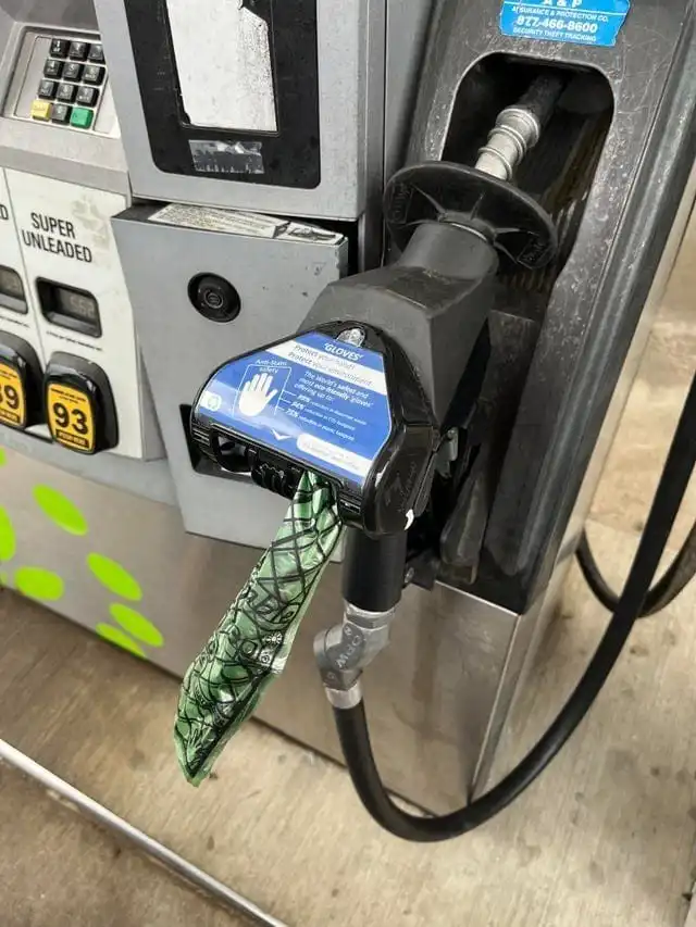 Шланги на заправке снабжены пластиковыми ёмкостями для перчаток, чтобы ваши руки оставались чистыми
