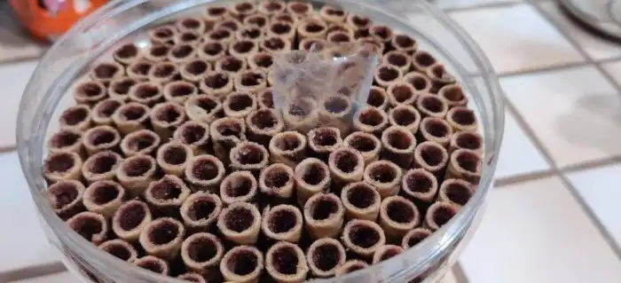 В этом контейнере с вафлями было две вафельки, завернутые в полиэтиленовую упаковку, чтобы было легче взять самые первые вафельные трубочки.