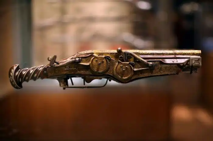Согласно книгам рекордов, вторым старейшим оружием является пистолет с колесцовым замком, изготовленный для императора Карла V в 1540 году немецким часовщиком Петером Пеком. Что делало этот пистолет особенным, так это то, что из него можно было стрелять одной рукой, поскольку это было первое самозарядное оружие.