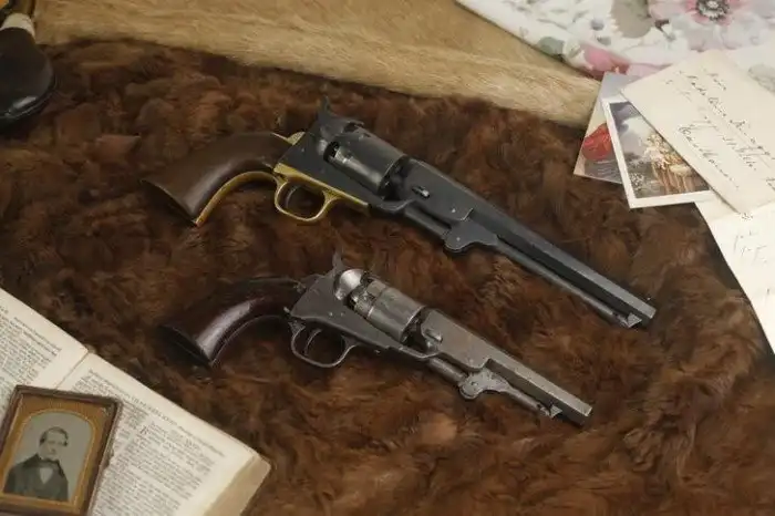 Два великолепных кольта, один карманной модели, сделанный в Лондоне, а другой американского происхождения — вероятно, купленный британским офицером викторианской эпохи в качестве личного оружия.