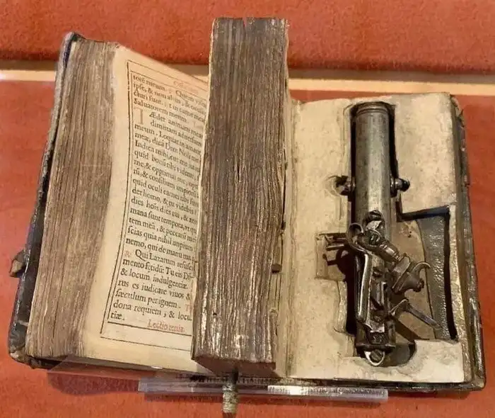 16. Пистолет, спрятанный в Библии, был изготовлен для Франческо Морозини, венецианского дожа (1619-1694). Владелец мог потянуть за шелковую закладку, чтобы выстрелить прямо из закрытой книги