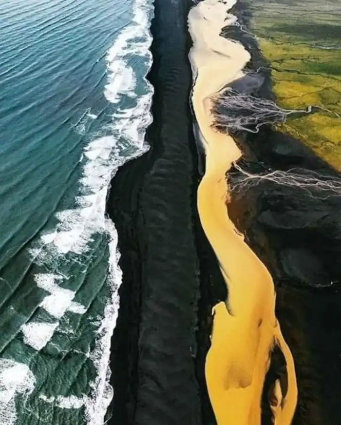 4. Место в Исландии, где встречаются зеленые поля, желтая река, черный пляж и голубое море