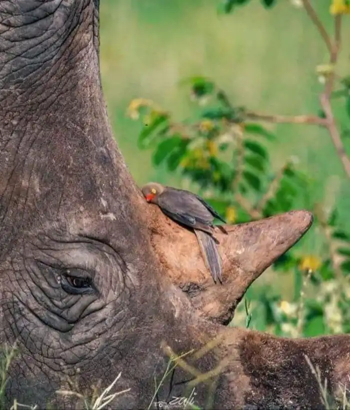 19. Красноклювый буйволовый скворец вздремнул на роге носорога