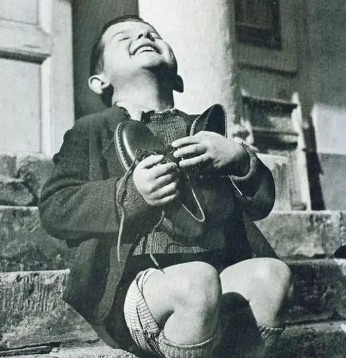 35. 6-летний австриец сияет безграничной радостью, получив новую пару обуви от Красного Креста в конце Второй мировой войны, 1945 год