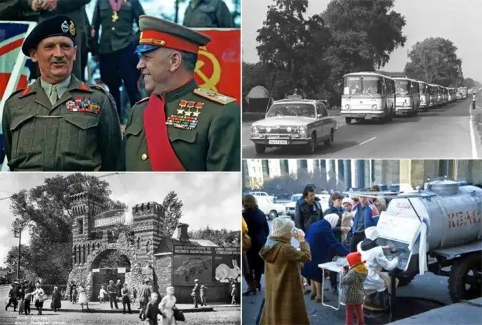 3. Маршал Советского Союза Георгий Константинович Жуков (1896—1974) разговаривает с британским фельдмаршалом Бернардом Монтгомери (Bernard Law Montgomery, 1887—1976) около Бранденбургских ворот Берлина. 12 июля 1945 года