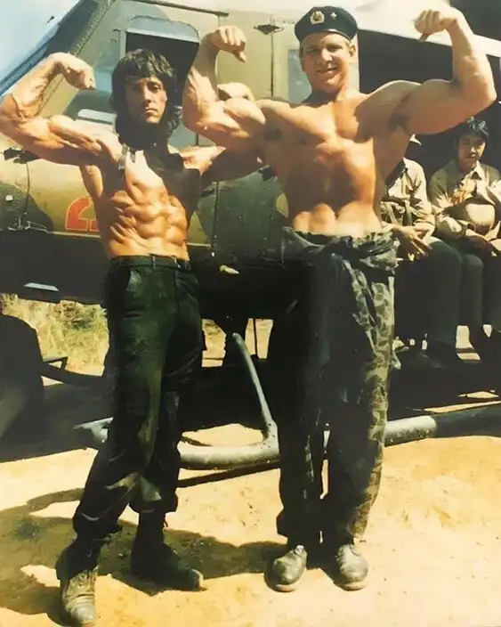 35. Рэмбо позирует для фото, с русским солдатом на съемках фильма. 1985 год