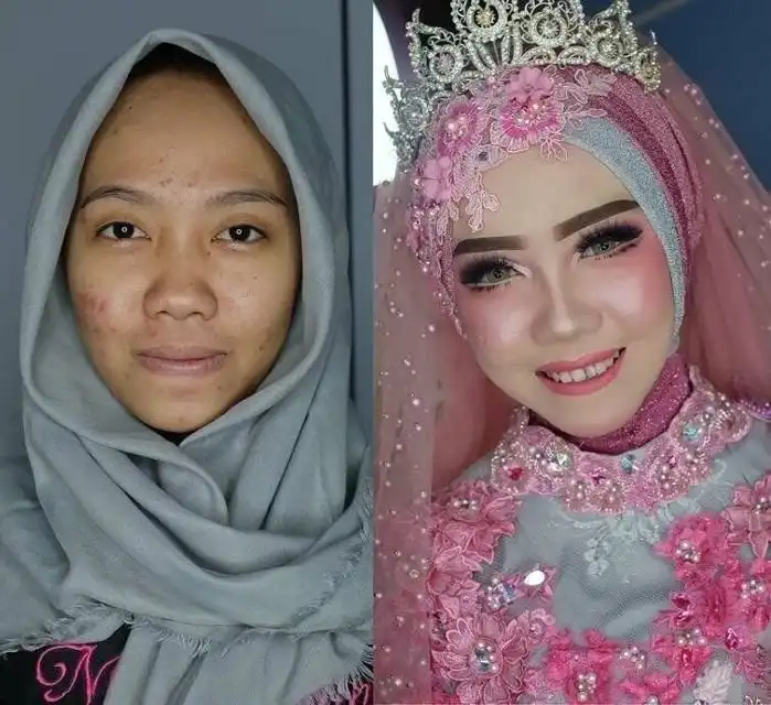 Цвет лица полностью изменен, нарисован другой нос, сделаны скулы, поменян цвет глаз. И под таким слоем косметики невеста выглядит неживой куклой, каким-то зомби. Это выглядит несколько пугающе, как по мне. Однако в своем желании выглядеть по-европейски, девушка явно преуспела.