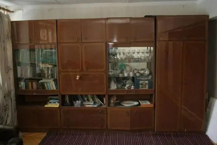 Огромный лакированный шкаф – шифоньер, без него не обходилась ни одна советская семья. Мало того, что он занимал большую часть комнаты, так еще и цвет темного дерева, делал его еще мрачнее. В современной квартире такой шкаф выгладит устрашающе, хотя хозяева убеждают, что он очень-очень качественный.
