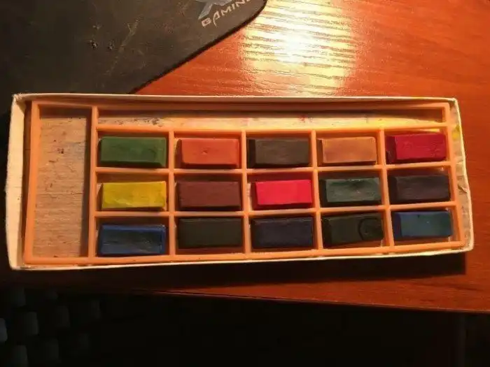Недорогие акварельные краски представляли собой сухие разноцветные "кирпичики". Чтобы добиться от них цвета, нужно было основательно размочить их влажной кисточкой.